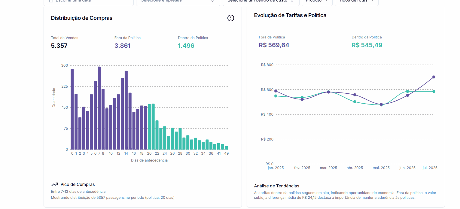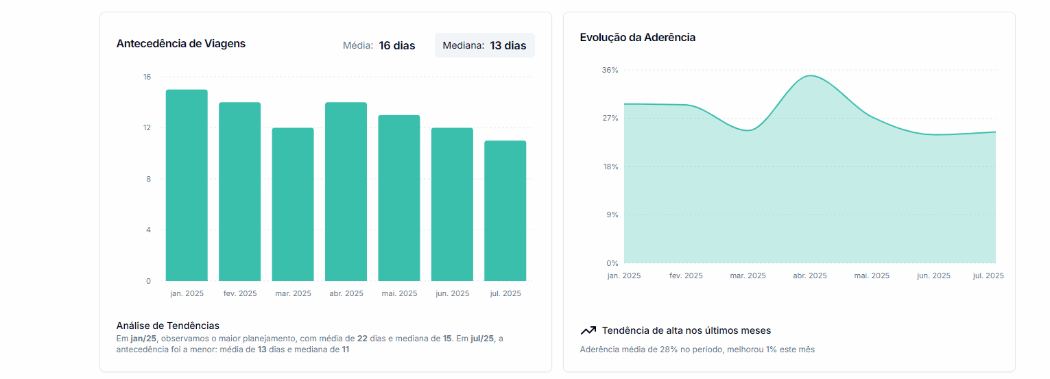 - Acompanhamento da Aderência às Políticas: Visualize mês a mês como sua empresa está se comportando em relação às políticas de antecedência. Gráficos como os apresentados na imagem